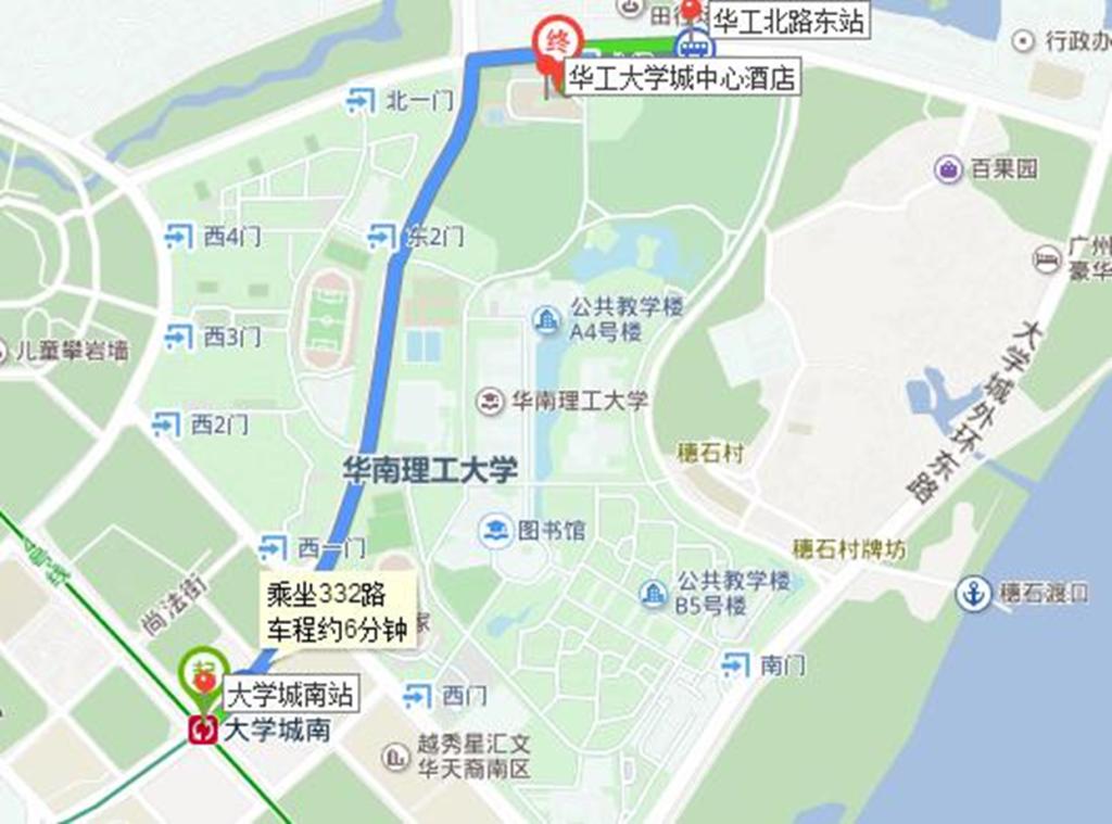酒店、地铁大学城南站及华工北路东公交车站的位置如下图: