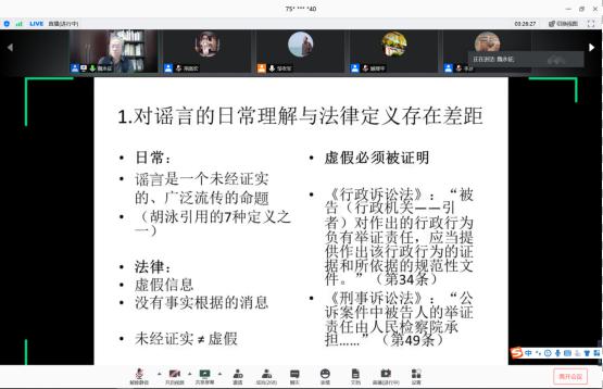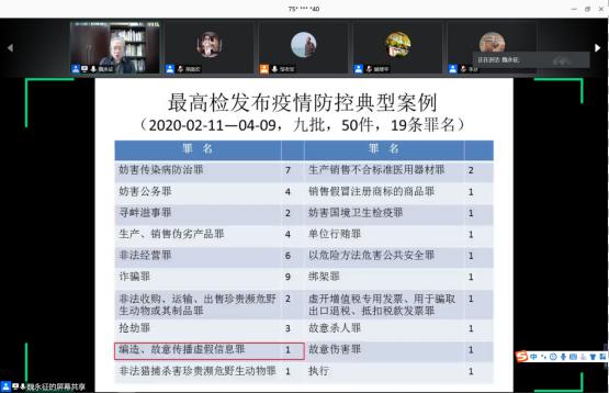 紧接着,中国新闻史学会媒介法规与伦理委员会学术顾问魏永征教授就“疫情防控与依法惩谣”的话题从法律的角度进行了讨论。魏永征老师认为,这次防疫战的打响就是从打击谣言开始的——早在1月1号,@平安武汉、新华社等媒体还有随后的央视等就发布了许多有关病毒疫情散布谣言者被依法惩处的新闻;在疫情防控工作全面开启后的一月下旬,国家相关部门下发的文件中就对编造故意传播虚假信息罪和寻衅滋事罪的要件构成、量刑尺度等进行了界定。在疫情期间发生的众多案件之中,魏永征老师发现,在整个疫情防控过程中,法律制裁的对象主要并不是谣言,而是类似诈骗与妨碍传染病防治这样的问题——这是因为谣言及谣言的负面影响,主要并不是依靠法律能够加以消除和防范的,法律采取的是一种强制手段,“通过法律打击,谣言就会没有了”的这种想法,是不切实际的。