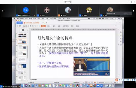 华中科技大学新闻与信息传播学院的牛静教授则结合疫情期间自己的生活见闻和研究观察,探讨了有关疫情中美国新闻发布会的信息公开制度和公众知情权的话题。牛静教授介绍到,美国白宫与各州的发布会基本上符合美国的政治文化——各州具有高度的自治性,总统其实是一个统筹的安排,各个州根据自己的情况来实施防疫措施。以纽约州为例,其发布会在美国的好评度近乎和白宫的好评度相近,信息发布基本遵守着这样的模式:首先详细展现数字,呈现出对疫情的全面掌控,利用非常多的图表来表现出疫情的变化(重症监护的人数、插管的人数、出院人数、死亡人数等等);第二个环节主要建立官员与民众之间一种共情式的问答解惑。