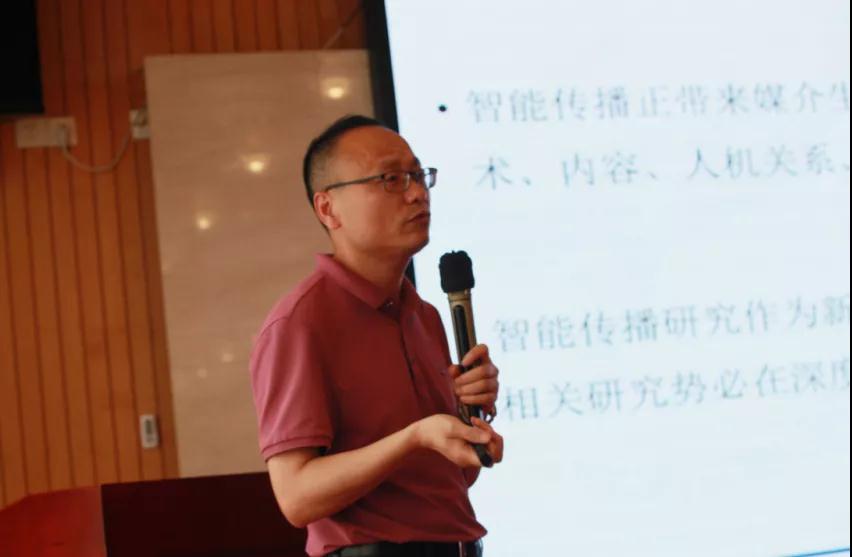 副院长、基地研究员邹军教授以智能传播研究的热门议题和未来趋势为题进行了演讲。从人工智能的诞生,到当下智能传播研究的主要议题及未来的研究趋势都进行了深入探讨。