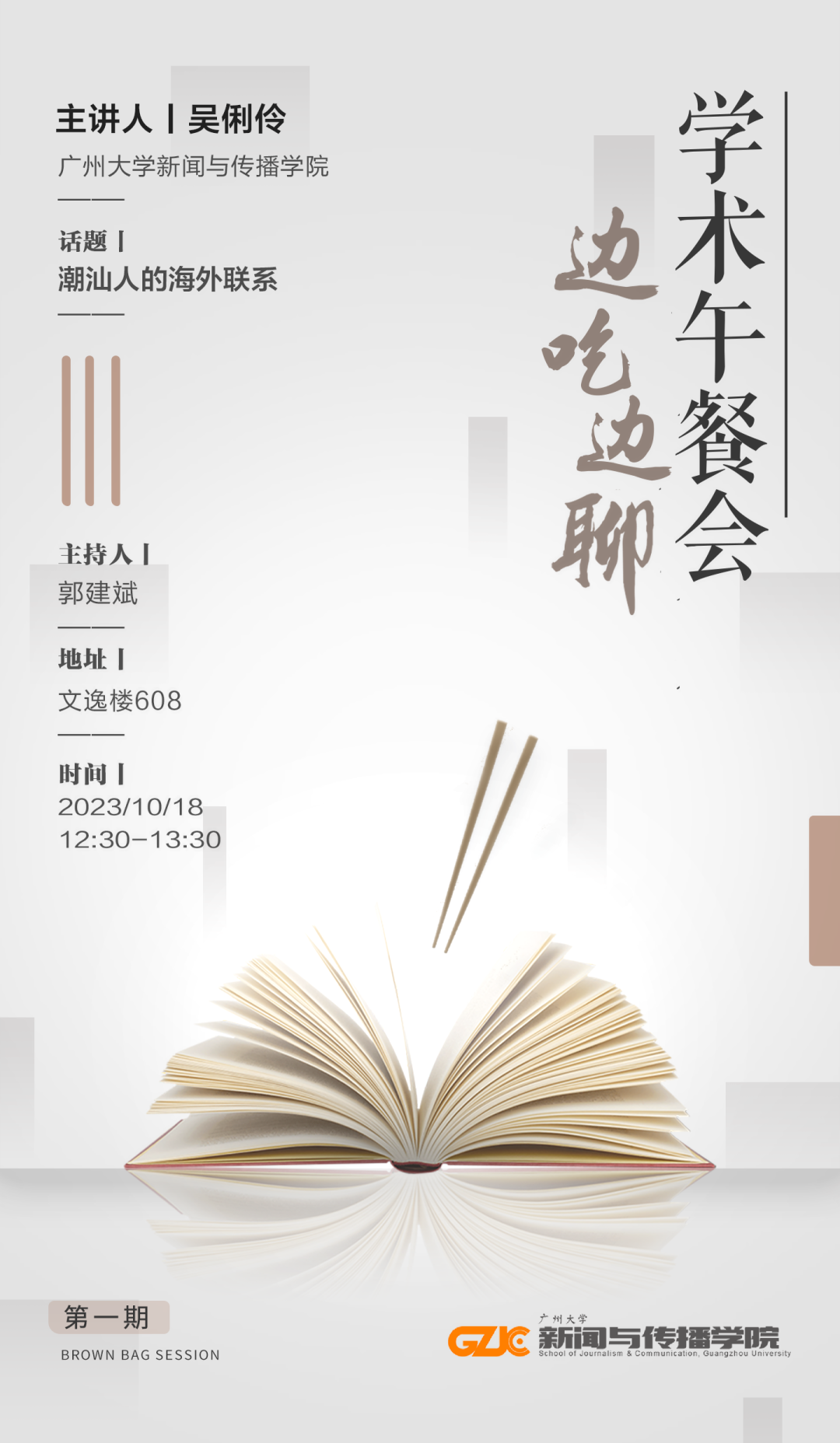 10月18日中午,“广传学术午餐会”边吃边聊活动首次在文逸楼608室顺利举办。本次午餐会由吴俐伶老师担任主讲人,作了题为“潮汕人的海外联系”的学术研究分享。午餐会由郭建斌教授主持,院长田秋生教授、党委书记邹军教授、副院长张杰教授、张爱凤教授等40余名师生出席了此次学术午餐会。