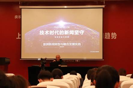 下午,在复旦新闻学院蔡冠深演讲厅,访学团成员一行聆听了“融媒体产品创新”主题讲座。来自澎湃新闻的副总编黄杨,通过讲述澎湃新闻的全面转型与融合发展,阐述了技术时代的新闻坚守。黄杨总编介绍了澎湃新闻及其从传统媒体向新媒体的转型之路,并分享了多个优秀的融媒作品。这些创新多样的作品,既有航拍、全景拍摄等多种拍摄手法的短片,又有漫画视频相结合的创新H5等,让我们极大地感受到当前融媒体时代下,媒体融合创新的更多可能性。
