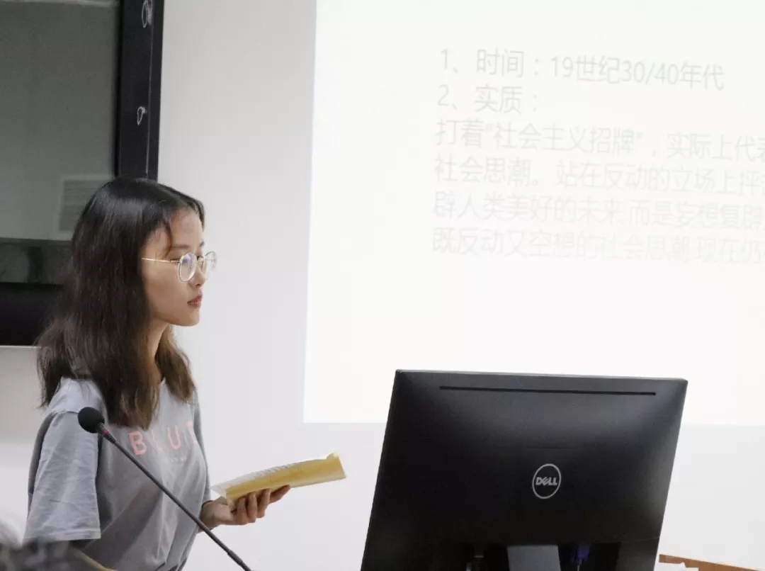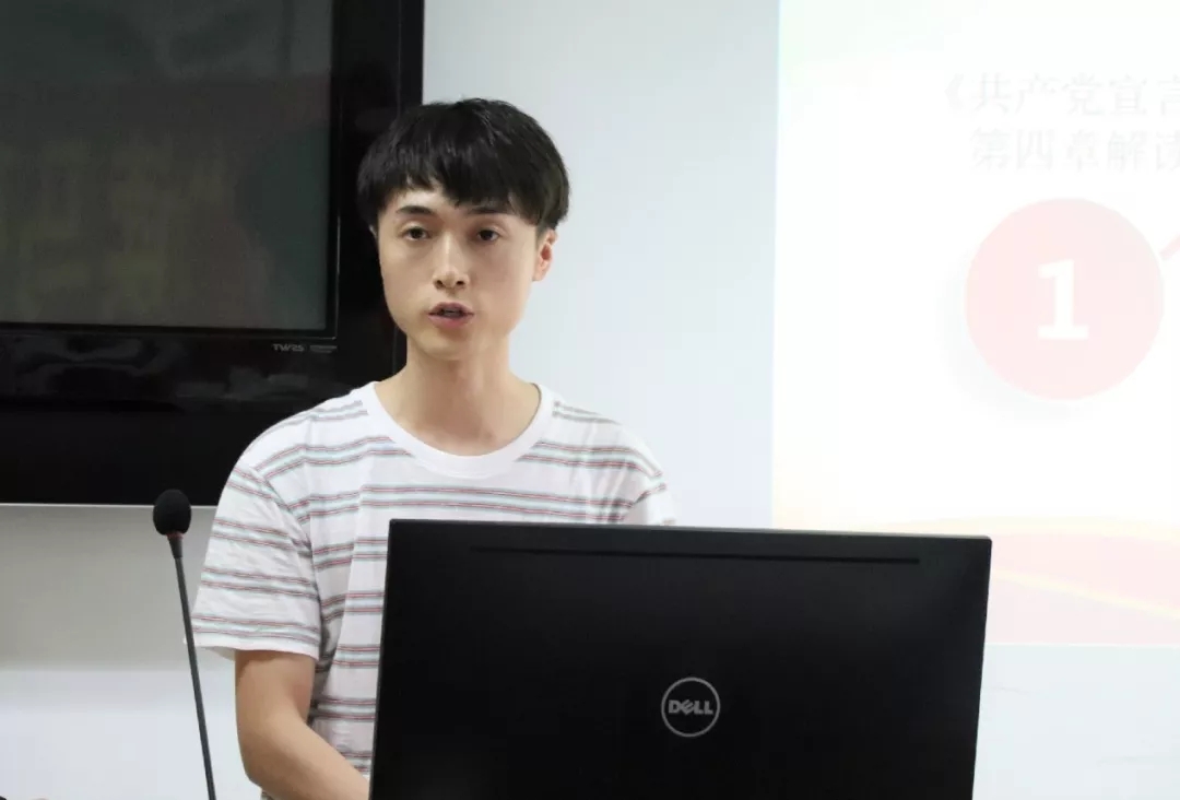 第四小组从四个方面去解读《共产党宣言》,分别是《共产党宣言》产生的背景,第一章主要内容的解读,难点句子的分析以及思考感悟。首先,第四小组从社会根源、阶级基础、思想来源三个方面来阐述《共产党宣言》产生的背景。其次,第四小组将《共产党宣言》的第一章资产者与无产者概括为“三个问题”和“一个结论”来梳理和理解。再者,第四小组对所学习章节的难点句子进行思考并解析。最后,第四小组展现了小组各成员对这一章的学习感悟并提出了几个经典的问题进行思考。她们还认为《共产党宣言》不只是简单地陈述与表达观点,它还有大量的时代背景作为补充介绍,整本书体现了作者缜密的逻辑思维,层层深入论证。然而马克思和恩格斯的观点会有一定的历史局限性,他们当时看到的资本主义正处于起步阶段,很多体制尚未完善,这种由资本主义社会所产生的经济危机推断出“当时的生产关系已经阻碍了生产力的发展”的观点带有一定的局限性。至少现在的资本主义国家仍然具有独特的生命力,社会主义取代资本主义还需要一定的时间以及相应条件的成熟。
