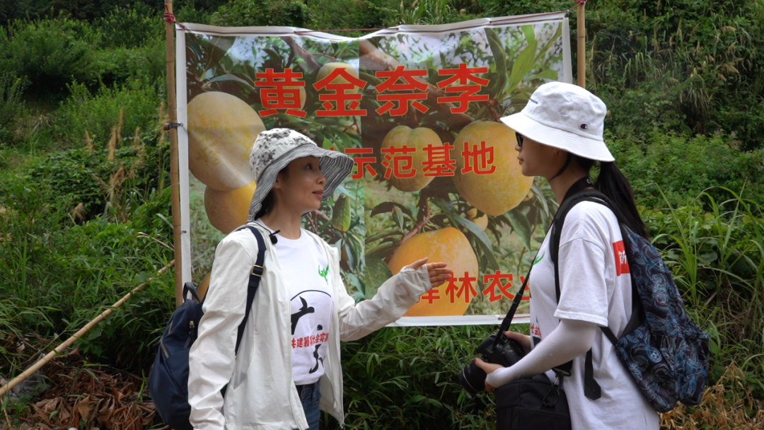 实践队员们将田间地头作为第一课堂,拿起摄像机深入果园内部进行采访拍摄。葱葱郁郁的树叶是天然的背景,套袋的黄金奈李摩擦着发出沙沙的响声。在指导老师的带领下,队员们充分发挥自身的专业素养与技能特长,进行了一次别开生面的出镜报道。