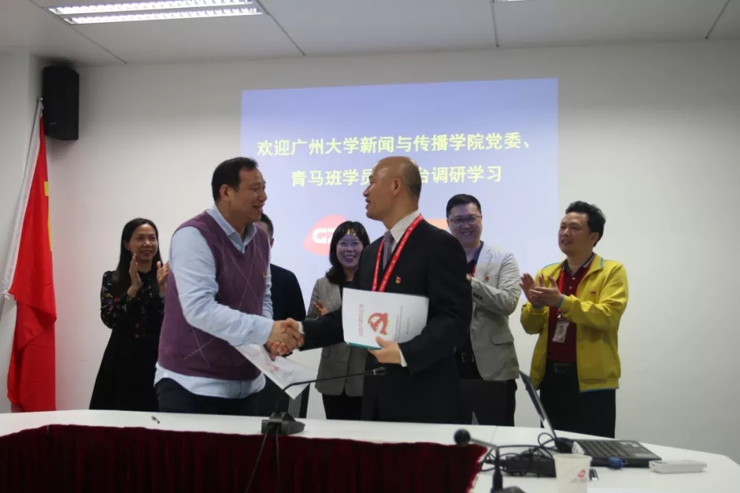 座谈会上还举行了党支部共建签约仪式。学院副院长兼广播电视艺术系党支部书记夏清泉老师与广州电视台竞赛频道党支部书记谭伟新主任分别代表各自党支部进行签订党建共建仪式。今后双方党支部将围绕“共建组织、共抓队伍、共享资源、共谋发展”为目标,以党建工作为龙头,共同组织开展党建活动,分享党建经验,交流在复合型人才培养、促进融媒体建设方面的经验,通过资源共享、优势互补,探讨党建服务发展、实现共赢的新途径、新模式。