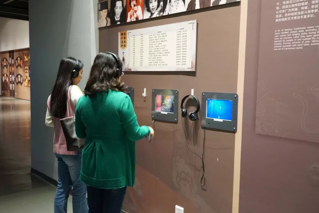李雁书记、林仲英副书记以及同学们在粤剧音频陈列区前驻足,戴上耳机仔细赏听了粤剧的各种音乐唱腔。林仲英书记回忆道,红线女是她们当年最喜欢的粤剧表演艺术家之一。并打趣道,让大家去听听其他人的唱腔,再回来听听红线女的,准觉得红线女的唱腔最好听。