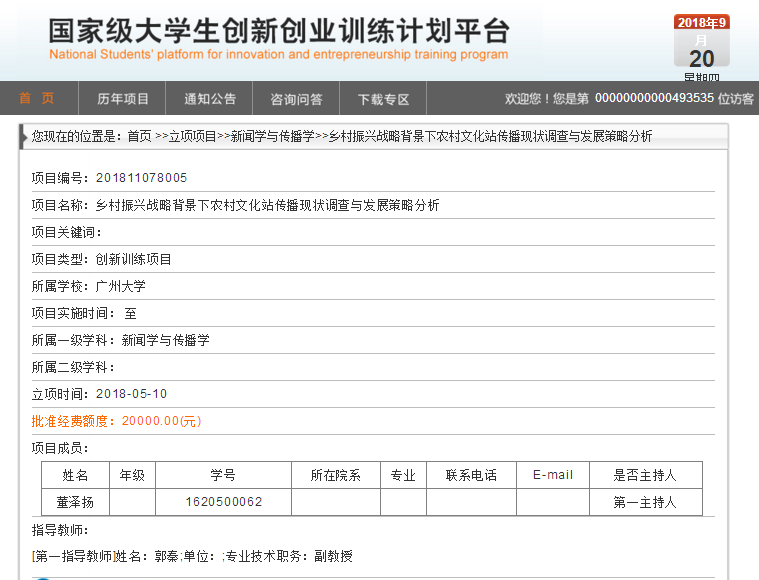 郭秦老师指导,广电162班董泽扬同学作为第一主持人的《乡村振兴战略背景下农村文化站传播现状调查与发展策略分析》获得国家级创新训练项目立项。