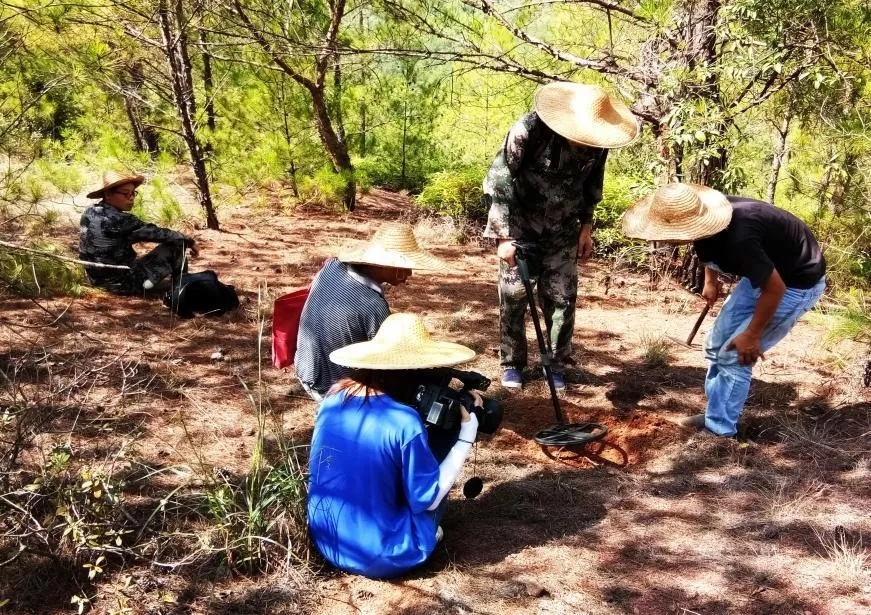 开始的一段山路是由大小不一的石块砌成的,两边缀满了茂密的绿色植物。我们一路直上,坡度陡峭,抵达第一个山头。村干部拿着探测仪在搜寻,没多久,探测仪发出了嗡响声,这是目标出现的提示音。泥层没挖多深就出现了一个环形铁圈,显然这不是当年的三河坝战役遗留的器械。确定过后,我们继续扛着机子跟随村干部搜寻下一个目标。不久,嗡响声再次响起,很幸运,这次我们挖到了一颗生着锈、裹着泥衣的子弹壳。看着这新出土的历史印记,大家脸上都布满笑意。