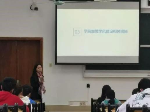 会议分为四个议程举行。第一个议程,学院党委副书记林仲英通报17级播音专业本学期考勤及课堂秩序情况。林仲英副书记指出:本学期播音专业学生的考勤情况并不理想,代课逃课的现象较多,缺勤率较高,有待改进。林仲英副书记还与同学们一起重点学习了学生学籍管理制度中有关考勤方面的规定以及奖惩条例,并向同学们介绍接下来学院为加强学风建设实施的相关措施。