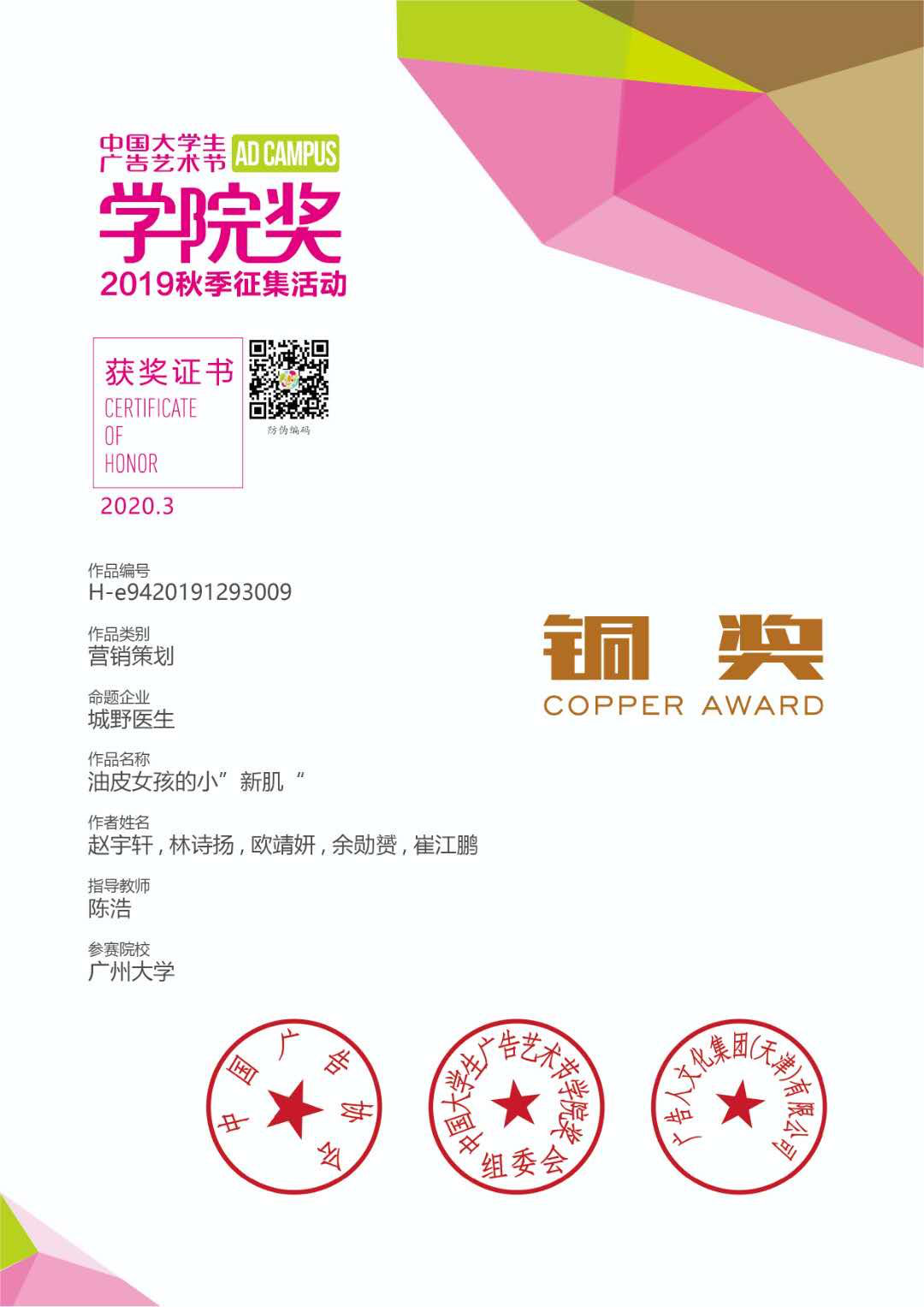 赵宇轩、林诗扬、欧靖妍、余勋赟、崔江鹏五名同学组成的团队在陈浩老师的指导下,为产品城野医生毛孔收敛水做了一系列策划活动,完成了名为“油皮女孩的小新肌”的营销策划,最终斩获铜奖。另外,由彩票网站