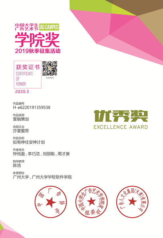 钟悦盈、李巧洁、刘丽聪、周才庚四位同学组成的队伍在陈浩老师的指导下,为莎普爱思企业做的宣传策划获得优秀奖。