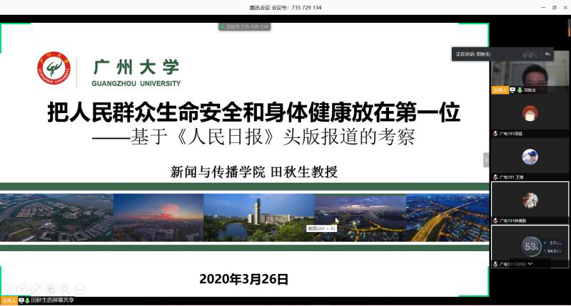 院长田秋生教授为广电191班的同学开展了以“把人民群众生命安全和身体健康放在第一位”(基于《人民日报》头版报道的考察)为主题的思政第一课。19级辅导员王子健老师也参与了本次课堂。