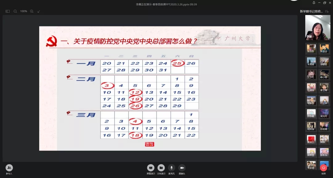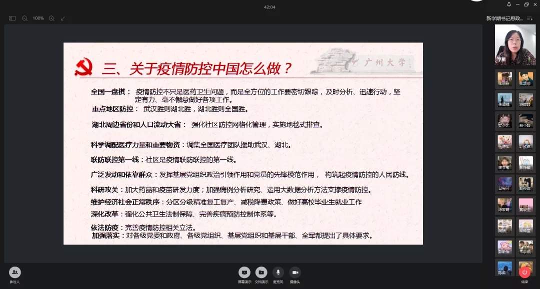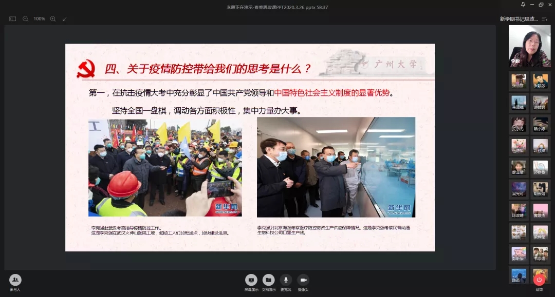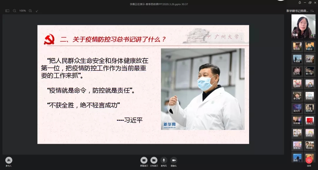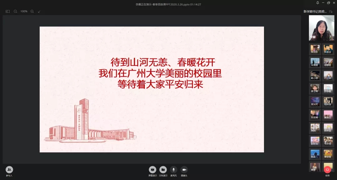 李雁书记希望学生们能在这次疫情大考中认真思考,明确自己未来的目标。最后,她引用学校党委屈哨兵书记对学生们的寄语“待到山河无恙、春暖花开,在广州大学美丽校园里等待着大家平安归来”,期待在不久的将来与同学们相遇校园,本次课程圆满结束。