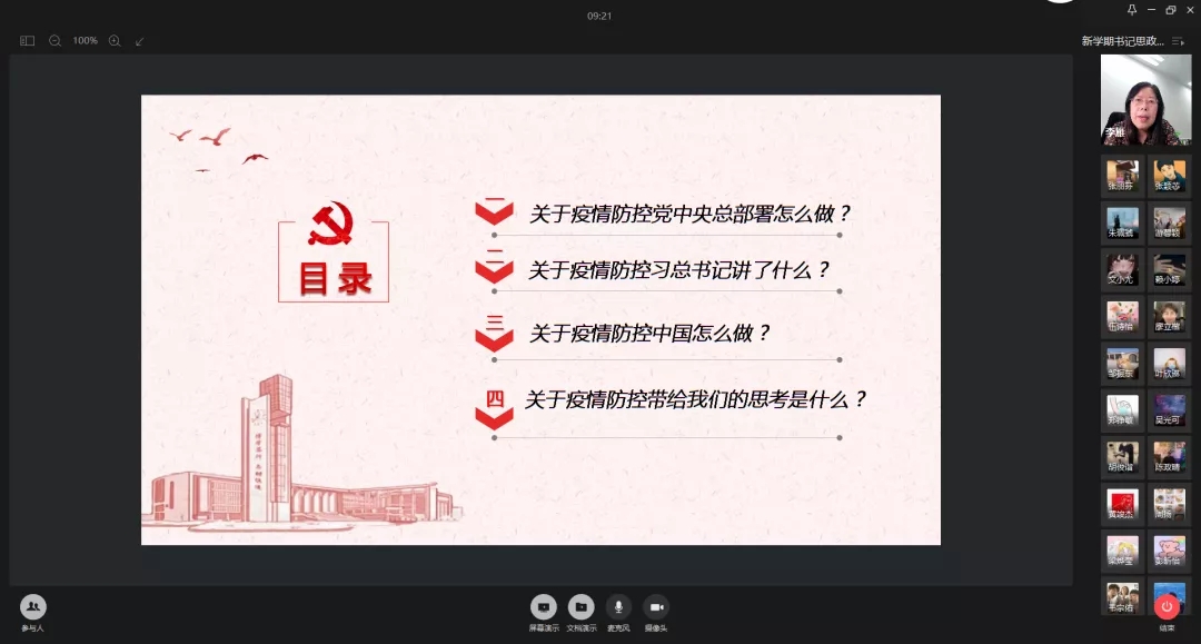 李书记还结合学校疫情防控工作要求,讲到疫情期间学校和学院每日对同学们身体健康等状况的了解、信息报送,开学不返校等举措,就是关心同学们生命安全的体现,师生们的身体健康和安全就是学校最关心的事情。随后,李雁书记又从“中国特色社会主义的制度优势”、“以人民为中心的执政理念”、“共建人类命运共同体的大国担当”三个方面带领学生们进行了认真思索,使学生们深刻认识到:全国14亿人民众志成城抗击疫情,体现了中国力量,展现出家国情怀;疫情不断蔓延全球,中国做好榜样,分享给其他国家经验助力全球战疫,展现“人类命运共同体”的价值和意义。李雁书记的细致讲解和多角度分析使同学们受益匪浅。