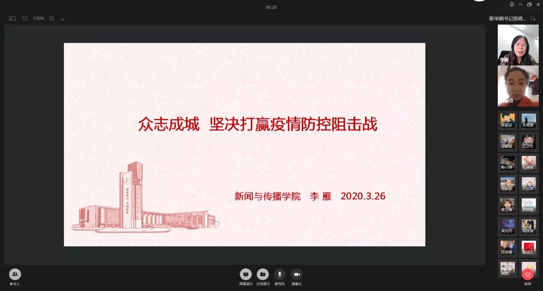 党委书记李雁以“众志成城,打赢疫情防控阻击战”为主题给网媒191班的同学们展开一堂别开生面的思政课,参与课堂的还有学院的学工办主任张丽芬老师。
