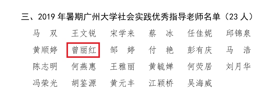 曾丽红副教授获2019 年暑期广州大学社会实践优秀指导老师称号;