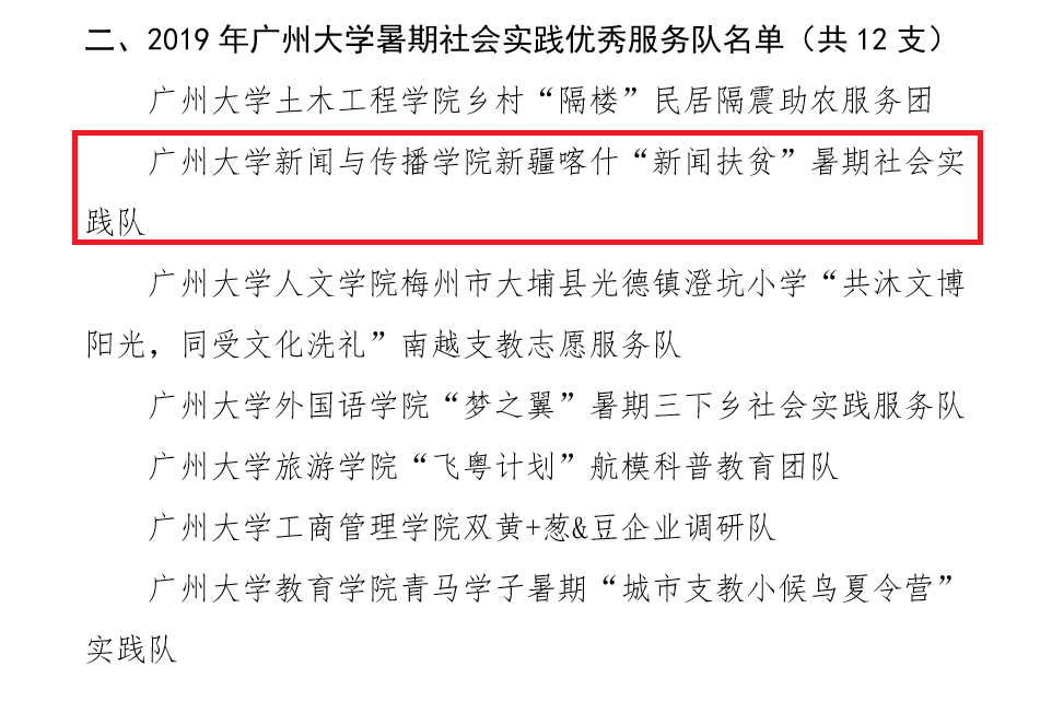 新疆喀什“新闻扶贫”暑期社会实践队获2019 年广州大学暑期社会实践优秀服务队称号;