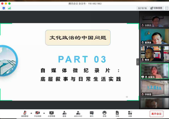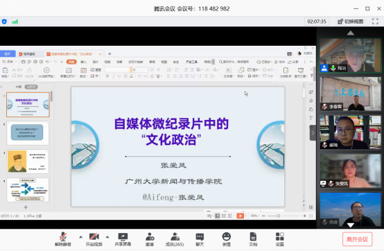 紧接着,张爱凤教授从研究缘起、何为“文化政治”、“自媒体微纪录片:底层叙事与日常生活实践”等方面做主题分享。
