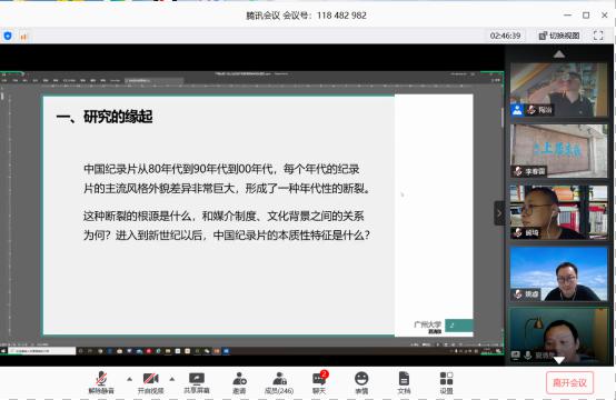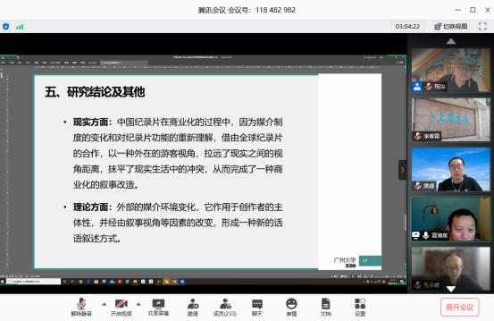 把纪录片作为一个很好的媒介和桥梁,能有效的打通两个学科,未来也可以整合出纪录片研究的学术的高地。孔令顺教授还补充道,在广州有着非常好的学习和研究纪录片这样一种内部和外部的环境,比如说有一年一度的广州国际纪录片节,也有着南派纪录片的这样一种创作的传统。孔教授逐一对每一位主讲嘉宾的讲座内容进行了点评,为此次学术活动画上了圆满的句号。