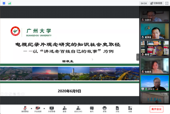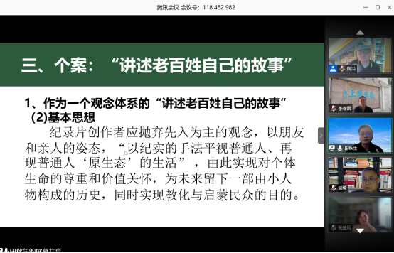 院长田秋生教授以《电视纪录片观念研究的知识社会史取径——以“讲述老百姓自己的故事”为例》为题从电视纪录片观念、知识社会史取径、个案分析“讲述老百姓自己的故事”这三部分内容做主题分享。