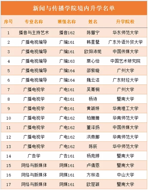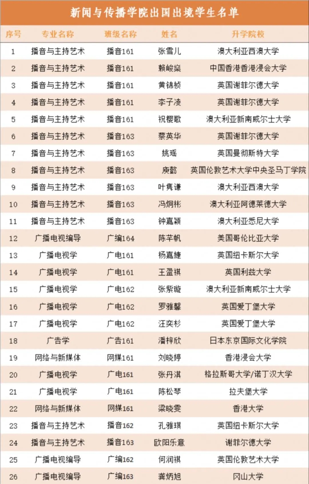 2020届本科毕业生383人,其中共43名同学被录取为硕士研究生,升学率达11.22%。共有17名同学升学境内高校,其中被“985工程”、“211工程”院校录取的应届毕业生有12人;境外升学26人,进入美国哥伦比亚大学、中国香港浸会大学、澳大利亚西澳大学、英国谢菲尔德大学等院校继续深造。