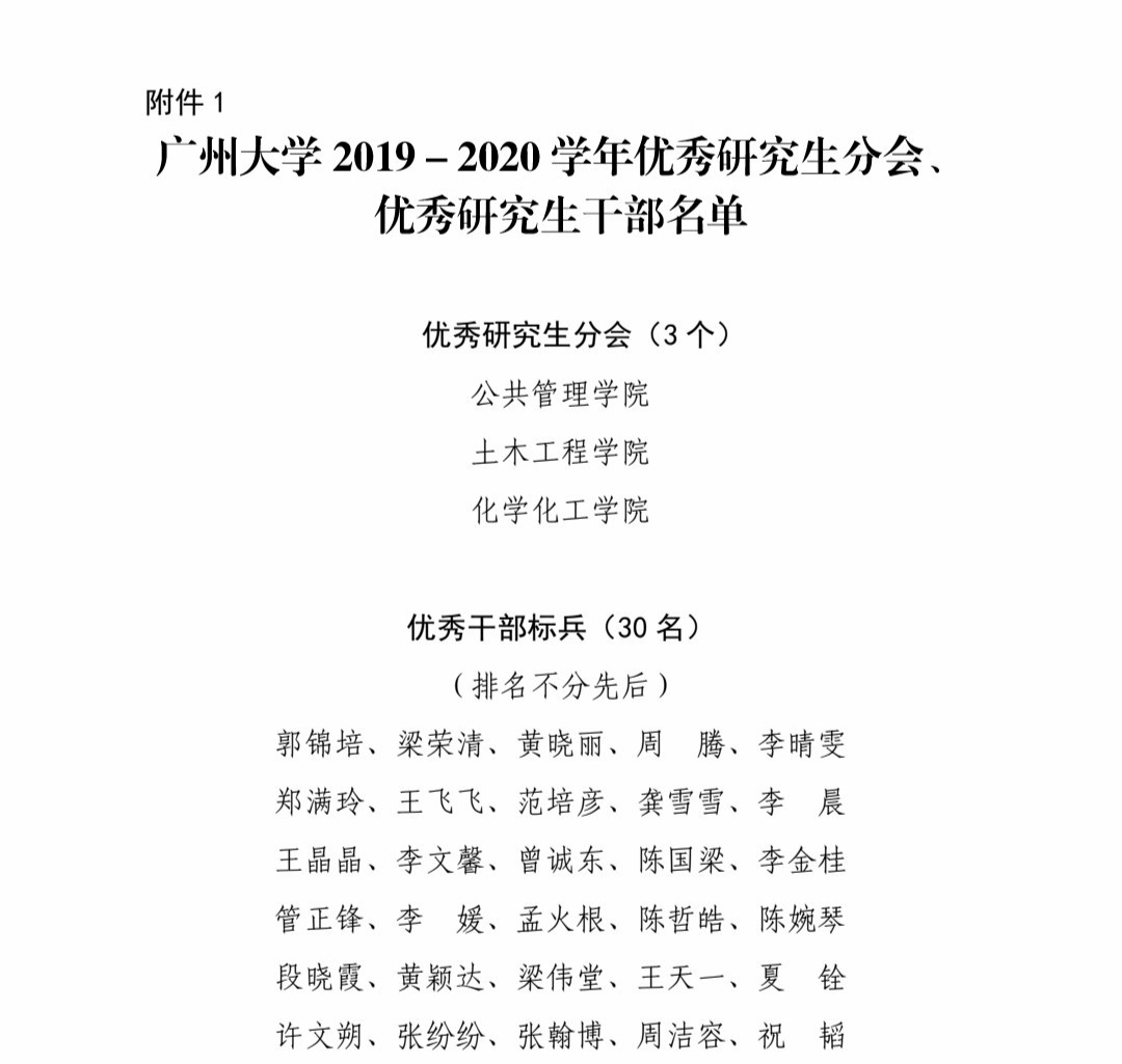为鼓励我校研究生刻苦学习、积极进取、全面发展,按照相关文件要求,学校组织开展了 2019-2020 学年优秀研究生分会、优秀研究生会干部及 2020 届优秀毕业研究生等评选工作,授予了 30 名研究生“优秀干部标兵”称号,89名研究生“优秀干部”称号(详见附件 1);并评定 141位研究生为广州大学 2020 届优秀毕业研究生(详见附件 2)。其中彩票网站