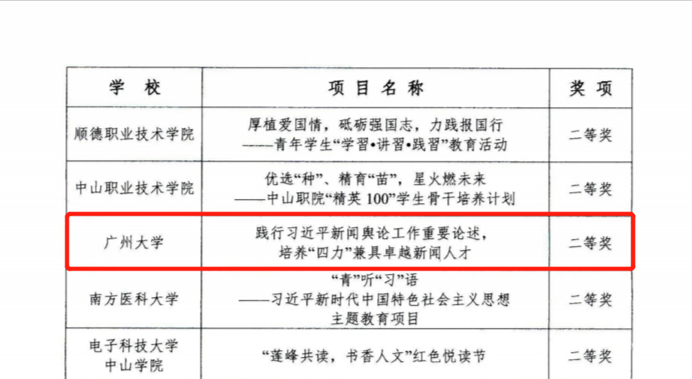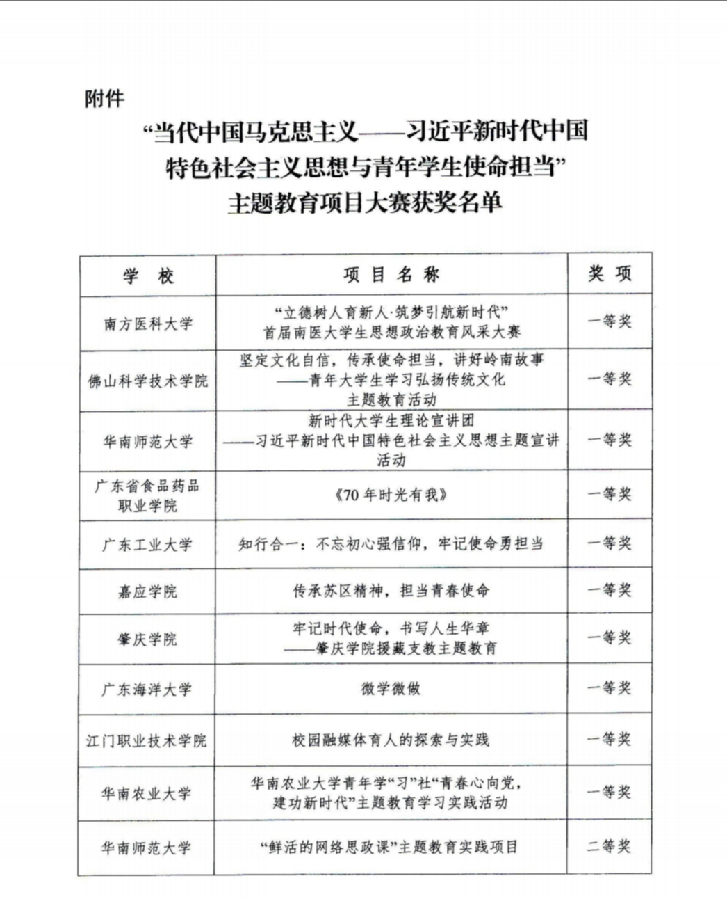 为科学有效地运用习近平新时代中国特色社会主义思想教育高校青年学生,引导广大青年学生认识时代使命、担当时代使命,2019年广东省委教育工委在全国高校组织开展了“当代中国马克思主义--习近平新时代中国特色社会主义思想与青年学生的使命担当”主题教育项目大赛,全省高校积极响应,精心组织,踊跃参与。经高校组织的初赛,省委教育工委组织的复赛、半决赛和决赛,评出一等奖10个,二等奖10个,三等奖20个,优秀奖18个。