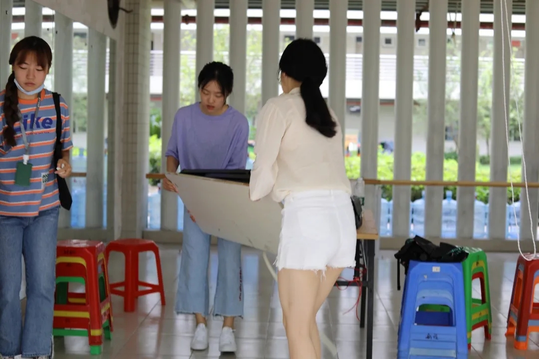 的基本介绍海报和师资宣传图,帮助新生明晰学院信息。现场还配有桶装水、水泵等设备,于炎炎夏日下为新生们带来一份清凉。