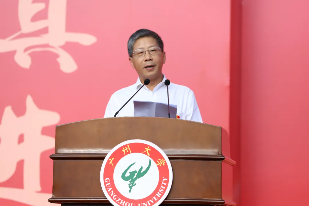 新生入学是一个学校持续发展和文化传承最为重要的标识。从今天起,你们就正式加入广州大学大家庭,成为广州大学一份子,是学校的主人和建设者,而不是过客和看客,希望大家有“家”的概念,爱惜它、奉献它、发展它,让广州大学因你们的加入变得更温暖更有力量。