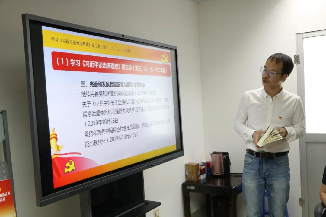 在支部书记刘涛的带领下,与会人员认真学习了《习近平谈治国理政》第三卷中关于完善发展我国国家制度和治理体系、深化改革和全面开放、提高保障和改善民生水平的内容,并以视频、讲解和讨论相结合的方式,进一步解读和深入领会习近平总书记在深圳经济特区建立40周年庆祝大会上的重要讲话的精神。