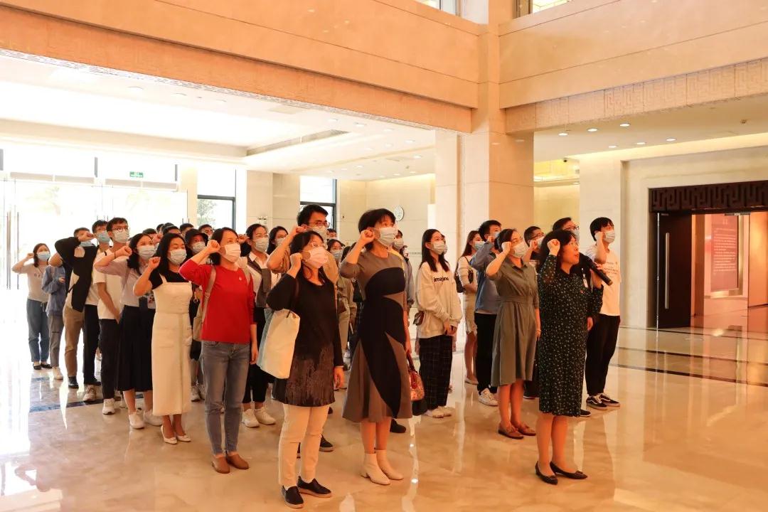 为确保安全有序参观,全体师生分为五条小队进入基地大厅。首先,进入大厅的全体师生党员在工作人员的引导下重温入党誓词,坚定而有力。宣誓开始之际,全体师生党员在李雁书记的带领下,神情肃穆、举起右手,整齐的面向党旗庄严宣誓。入党誓词下刻着一行文字:不忘初心,牢记使命。正是表达了大家牢记着党的宗旨,永葆初心本色,也是开展此次党性教育实践活动的目的。