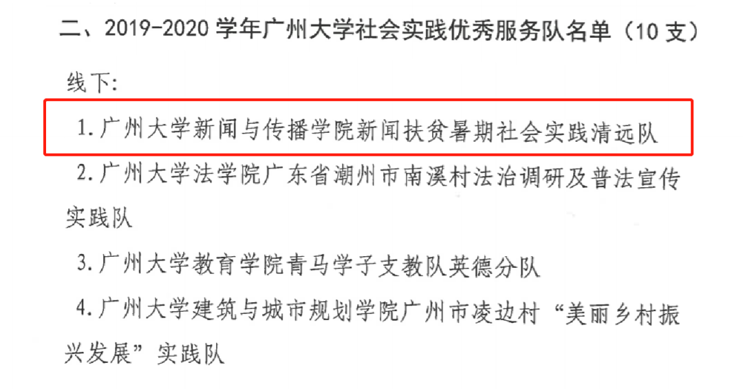 新闻扶贫暑假社会实践清远队获2019-2020学年广州大学社会实践优秀服务队称号;