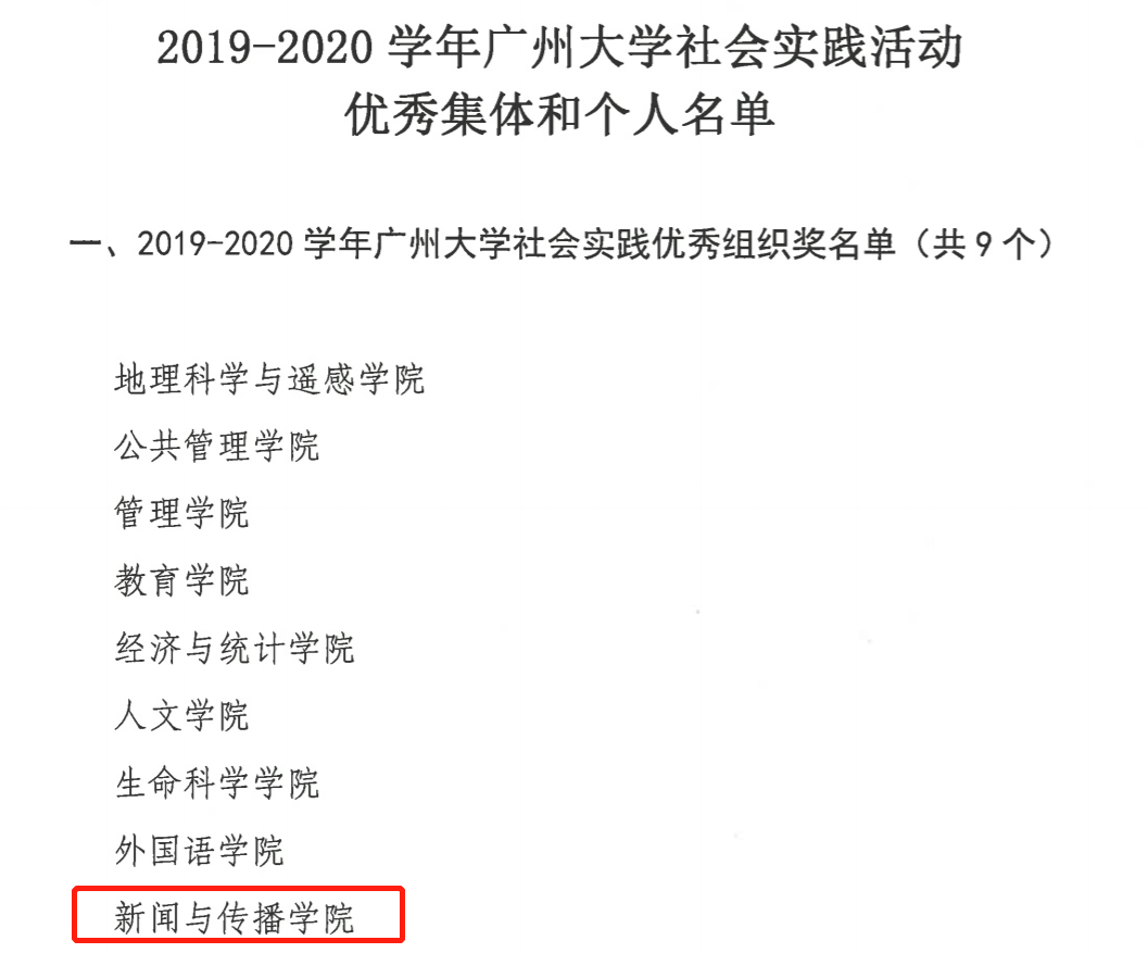 获2019-2020年广州大学社会实践优秀组织奖;