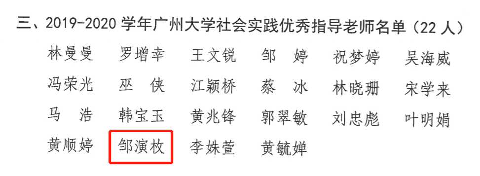 团委书记邹演枚获2019-2020学年广州大学社会实践优秀指导老师称号;