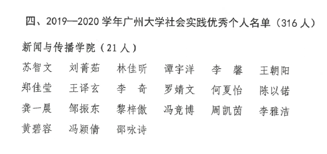 苏智文等21人获2019-2020学年广州大学社会实践优秀个人称号;