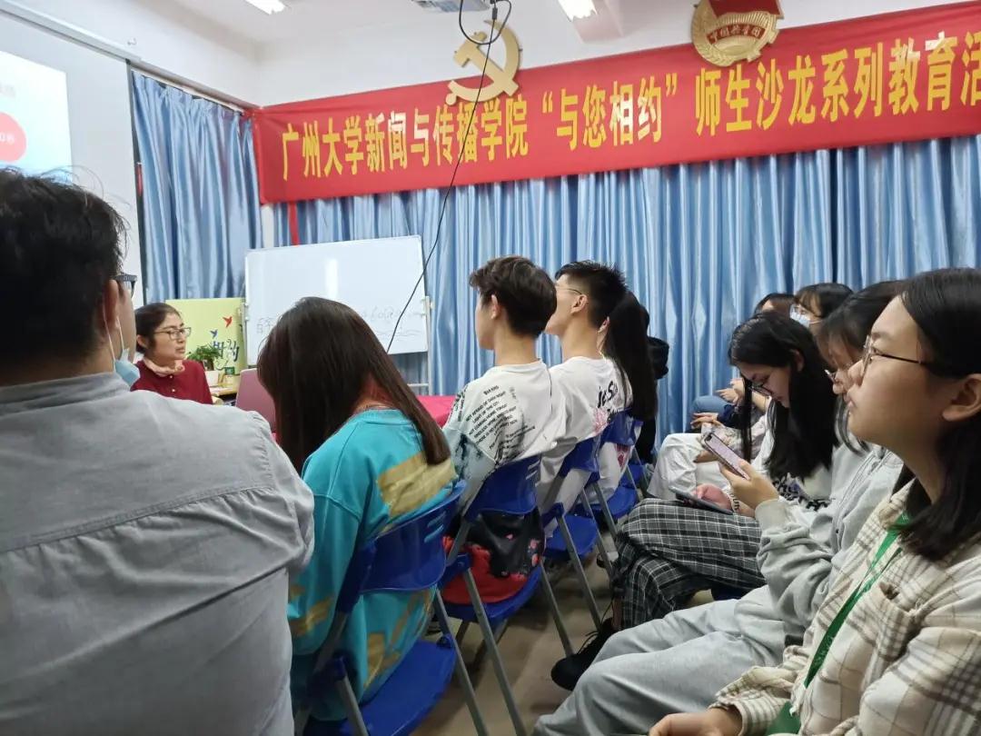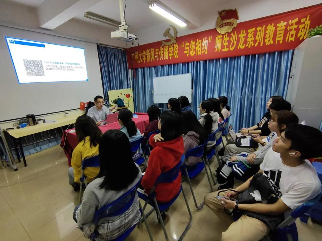 第十二期“与您相约”师生沙龙系列教育活动在学生宿舍竹苑4栋“五室一站”开展。本期师生沙龙分别由学院三位老师主讲,每位老师带来不同的沙龙主题,其中,林渊渊老师主讲“竖屏时代视频作品的编辑技巧”、李彦老师主讲“中国新闻奖获奖作品赏析”、王泸生老师主讲“学校经典阅读:《浮士德》分享”。
