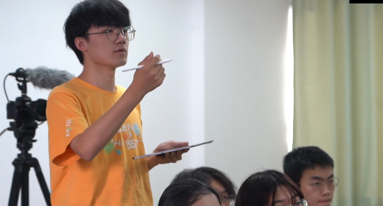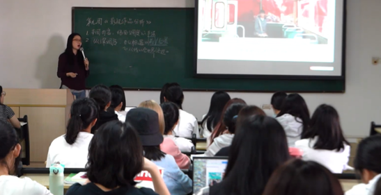 “摄影机与演员走位如何调度?” “镜头、机位摆设和演员有何注意事项?”以上述问题为引,魏晨捷老师首先讲述了镜头内和镜头外纵深、对比和重复等手法的场面调度基本知识,为同学们接下来的观影任务预热;随后,魏晨捷老师让同学们带着疑问观赏《我和我的祖国》等国庆献礼电影的片段,同时提示同学们要记录影视画面中的信息和细节,以便提升观影体验,进而结合案例调动知识点建构知识体系。