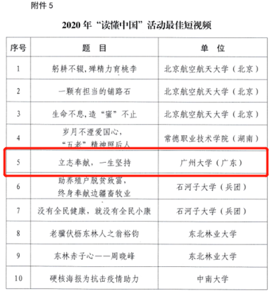 陈思达、曹璇、颜璐、卢珮瑄4位同学参与访谈我校周福霖院士的短视频《立志奉献,一生坚持》在教育部关工委主办的2020年“读懂中国”活动中被评为最佳短视频。