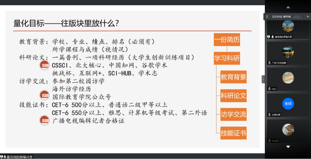 一份好的简历浓缩了大学生的学业表现和实践经验,是展示个人能力的最好名片。而学会量化目标,带着如何打造好一张名片的想法去规划大学生涯,将影响大学生在是否参加比赛、是否加入社团等方面的抉择,明确努力的方向并为其列出行动方案,这样才会对未来的发展有一个更清晰的规划。