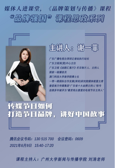 《品牌策划与传播》课程邀请到广东卫视《丝路会客厅》栏目制片人、主持人谢一菲,为师生们带来一场题为“如何打造节目品牌 讲好中国故事——以广东卫视《丝路会客厅》栏目为例”的精彩分享。