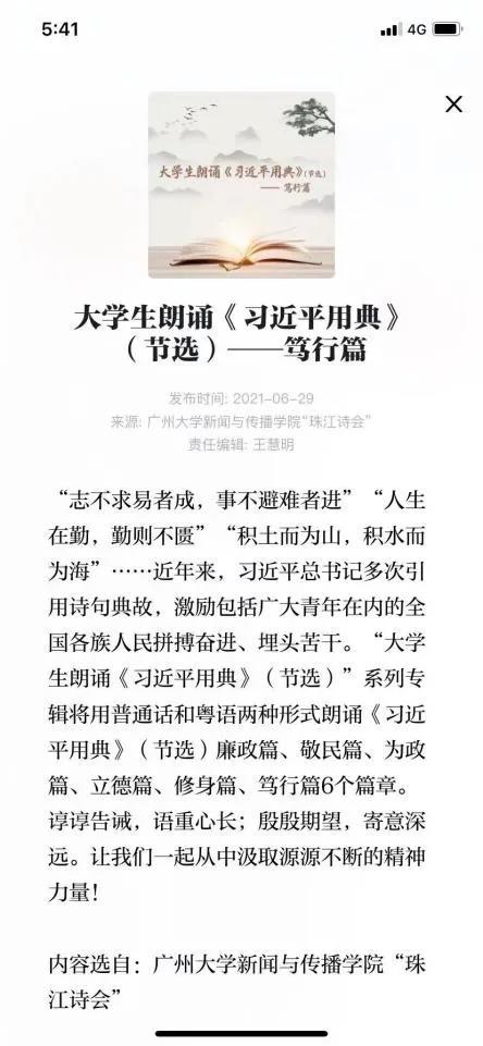 于2020年5月正式创办“珠江诗会”公众号。今年6月29日,“珠江诗会”公众号朗诵作品正式登陆中宣部《学习强国》平台。