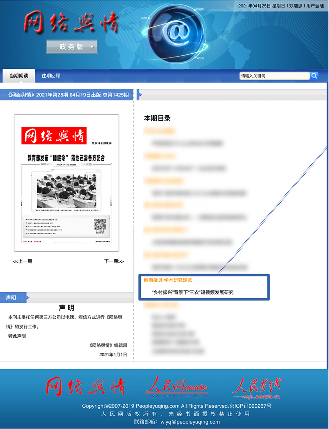 在张爱凤副院长的指导下,团队将先前完成好的成果不断打磨,不仅撰写了长篇调研报告参加挑战杯竞赛决赛,还将报告的精简版《“乡村振兴”背景下“三农”短视频发展研究》发表至《网络舆情》内参刊物。
