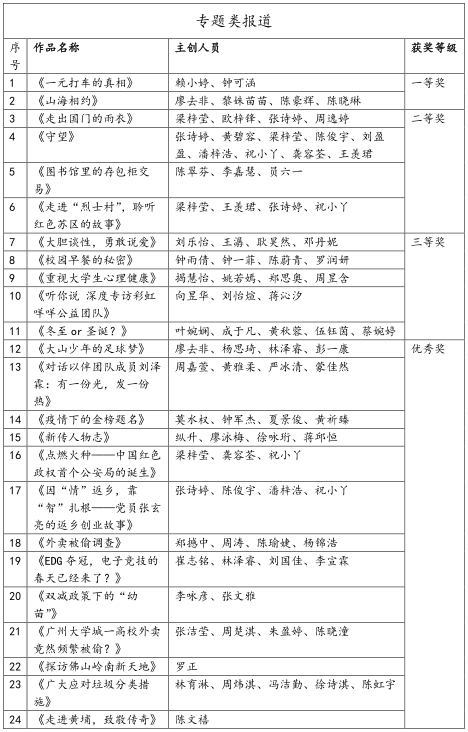 本次大赛共收到投稿作品50余部,分为消息类作品和专题类作品两个组别,评委围绕《电视新闻学》的教学要求,从选题价值、新闻策划、记者采访能力、画面和声音的运用能力,以及视频拍摄水平及后期制作质量等几个评判维度对作品进行了综合打分,现将获奖名单公布如下:
