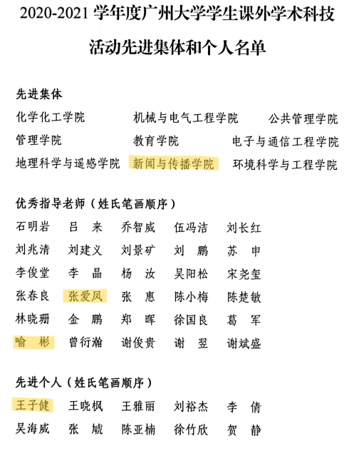 获2020-2021学年度广州大学学生课外学术科技活动先进集体;张爱凤老师的两个项目分别获国赛二等奖、省赛特等奖,被评为优秀指导老师;喻彬老师指导的项目获国赛三等奖,被评为优秀指导老师;王子健老师获评先进个人。
