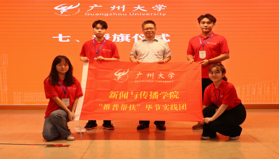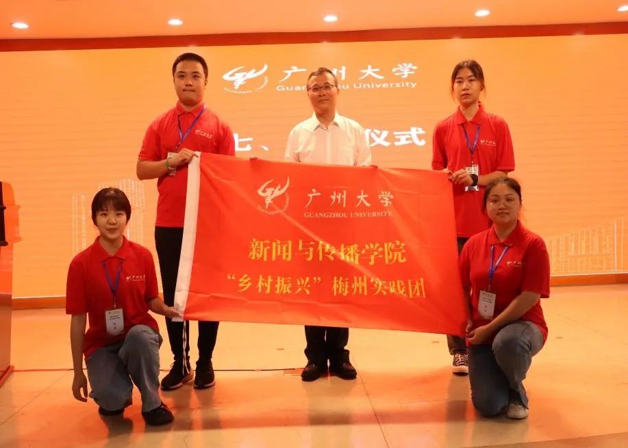 ▲广州大学副校长吴开俊为“乡村振兴”梅州实践团授旗