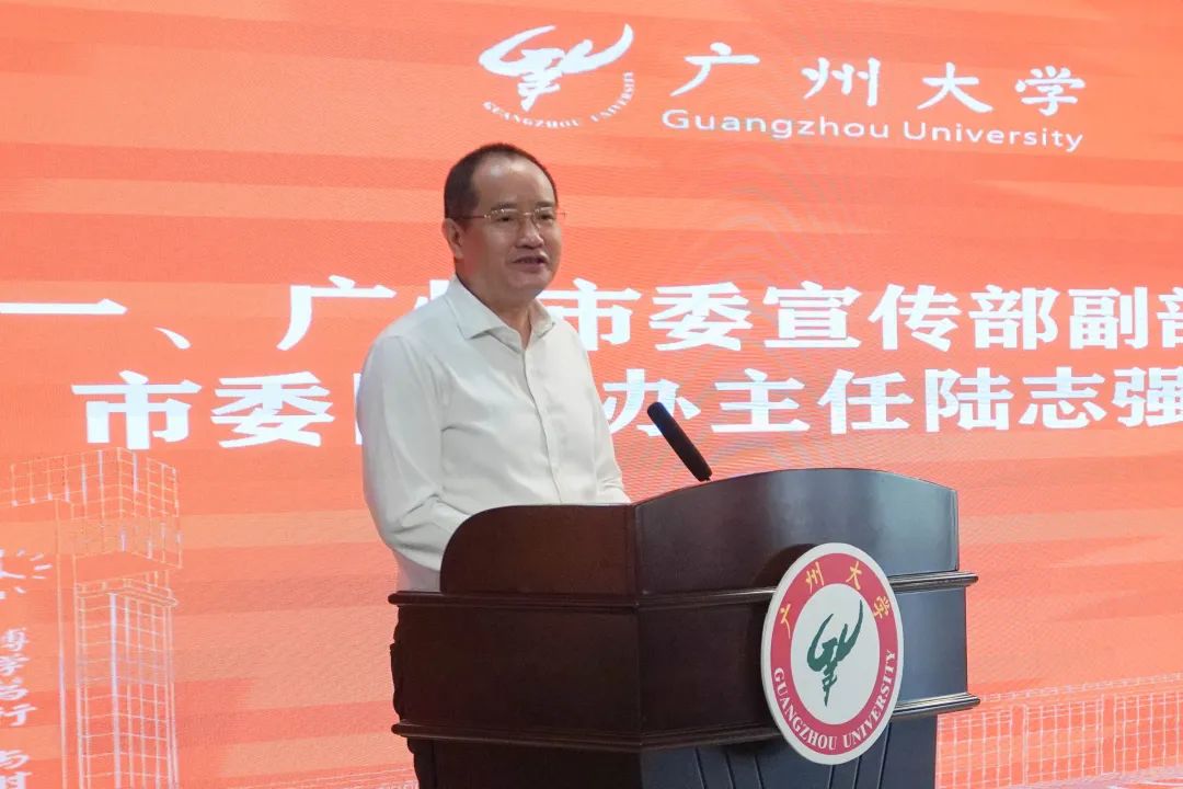 仪式伊始,广州市委宣传部副部长、市委网信办主任陆志强为实践活动致辞。陆部长引用习近平总书记在庆祝中国共产主义青年团成立100周年大会上的讲话:“要培养担当实干的工作作风,不尚虚谈、多务实功,勇于到艰苦环境和基层一线去担苦、担难、担重、担险,老老实实做人,踏踏实实干事。”寄语即将开启实践活动的师生们,期待大家在实践活动中用心体会、深刻领悟习近平总书记所讲“脚下有泥,心中有光” “奋斗不只是响亮的口号,而是要在做好每一件小事、完成每一项任务、履行每一项职责中见精神” 的深刻内涵,用“非凡脚力出眼力,勤想多思著华章”的期盼勉励大家在基层社会实践这个大课堂中,深入社会、了解国情、接受锻炼,不断增强脚力、眼力、脑力、笔力,全面展现广州大学的风采和青年的良好风貌。