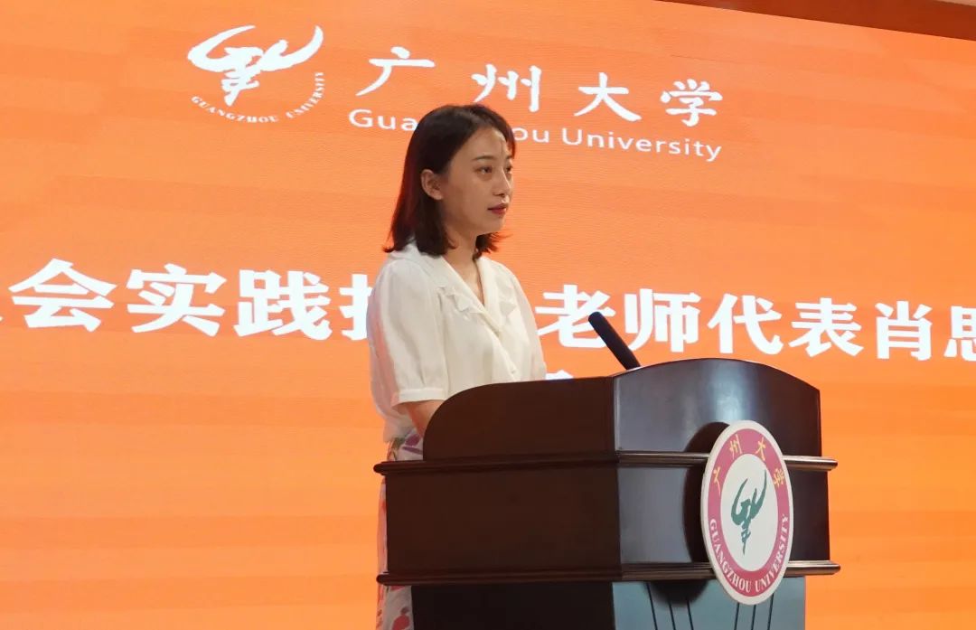 毕节实践团指导老师肖思为在发言中讲述了梅州羊岭村扶贫干部耿素芳,作为第一批驻村女干部,带领全村脱贫致富成为“鸽子书记”的精彩故事,鼓励同学们在暑期实践当中用自己的文字和影像去记录我们的时代;希望同学们在实践中,边学、边做、边思考三个问题:一是读书与实际生活的关系问题;二是想象中的未来和脚踏实地的关系问题;三是思考我们和国家的关系。她说,祖国的过往青年无法参与,但是祖国的未来将由青年来见证、记录与创造。希望大家可以将自身发展融合到国家发展中,更好的为社会做贡献,并借用英雄航天员刘洋出征前的一句话:“愿我们每个人心中有山海,眼里有星辰,脚下有泥土,一次次把今天的故事写满每一寸土地”,表达了对同学们的真挚期望。