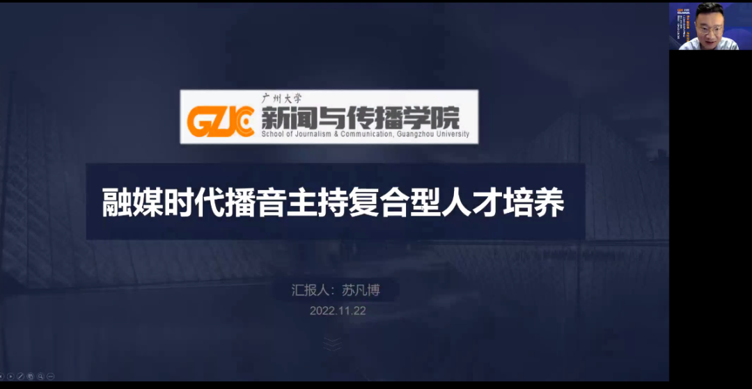 播音主持艺术系主任苏凡博副教授分别从时代背景、地域优势、专业定位针对“融媒体时代播音与主持复合型人才的培养”进行主题汇报。苏凡博副教授将“融媒体时代播音主持复合型人才的培养探索”的历程概括为三个发展时间段,并针对“全媒体时代主播人才培养模式”提出了加强党建引领和立德树人、加强核心课程内涵建设、探索电竞主播培养体系、提升学生创新创业能力等四个方面的举措。