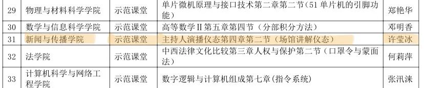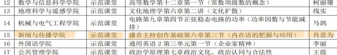 共有3个示范课堂项目入选,分别为肖思为老师负责的播音主持创作基础第六章第三节(内在语的把握与应用),曾丽红老师负责的新媒介素养与数字文化第十五章第二节(流浪地球的家国叙事文化与人类命运共同体理念)以及许莹冰老师负责的主持人演播仪态第四章第二节(场馆讲解仪态)。