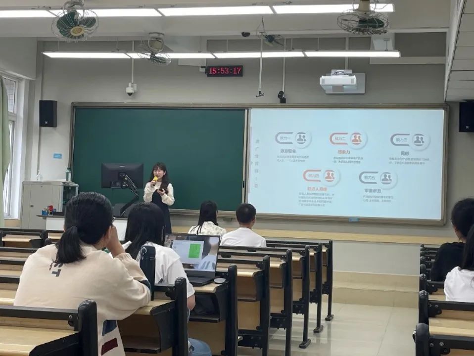 谈到大家比较关注的广告营销类比赛和创新创业类比赛,学姐系统地介绍了两类比赛的大致环节以及需要的能力。她表示,创新比赛是从零到一的过程,需要我们拥有天马行空的想象力去敢做感想,紧跟时代的步伐,多关心了解大众的最新喜好。运用经纪人思维,用最优方式追求自己的主观目标、明确自己的定位,同时多进行技术赋能,这样打磨出来的成果会更具备竞争力。